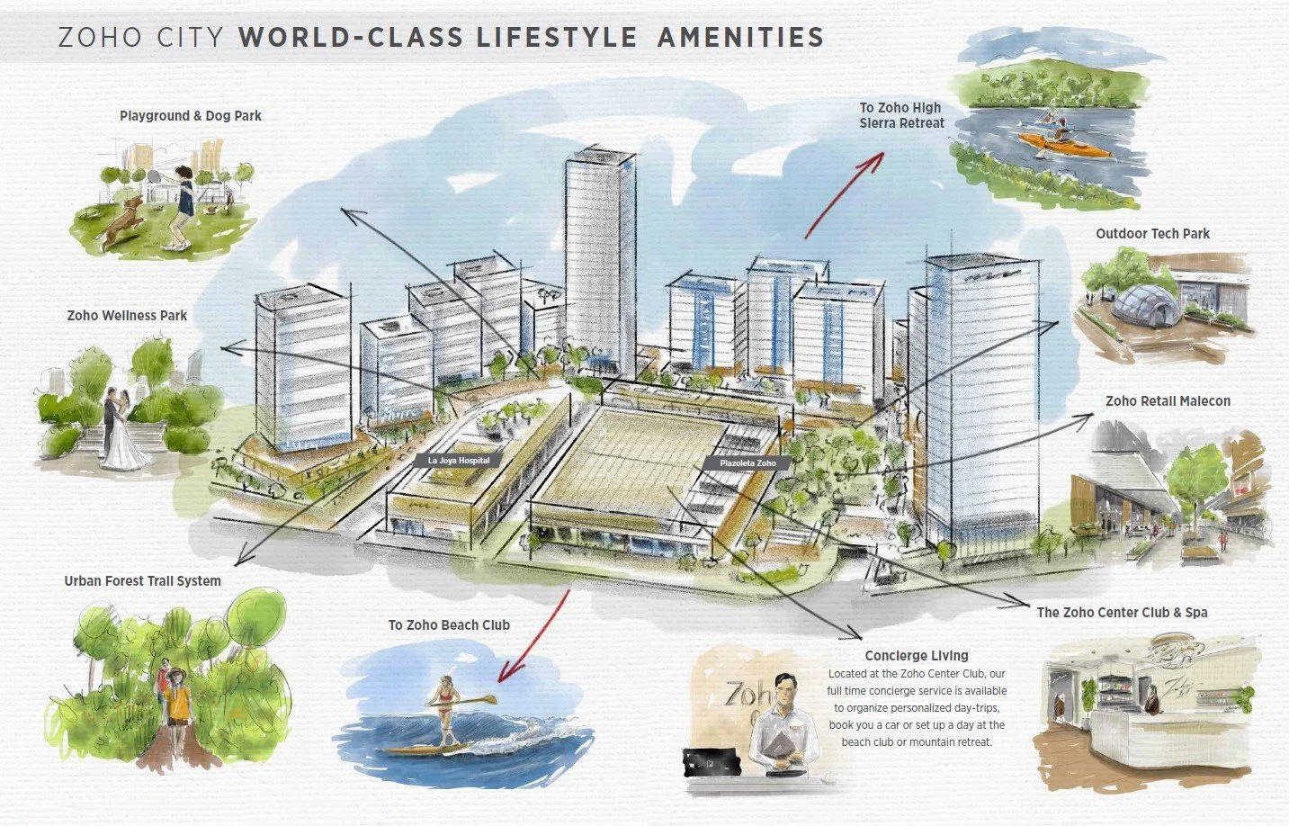 Zoho City es un lugar para vivir, cuidarse, trabajar, divertirse, comprar, convivir con la naturaleza, aprender, cuidar la salud, descansar e innovar.