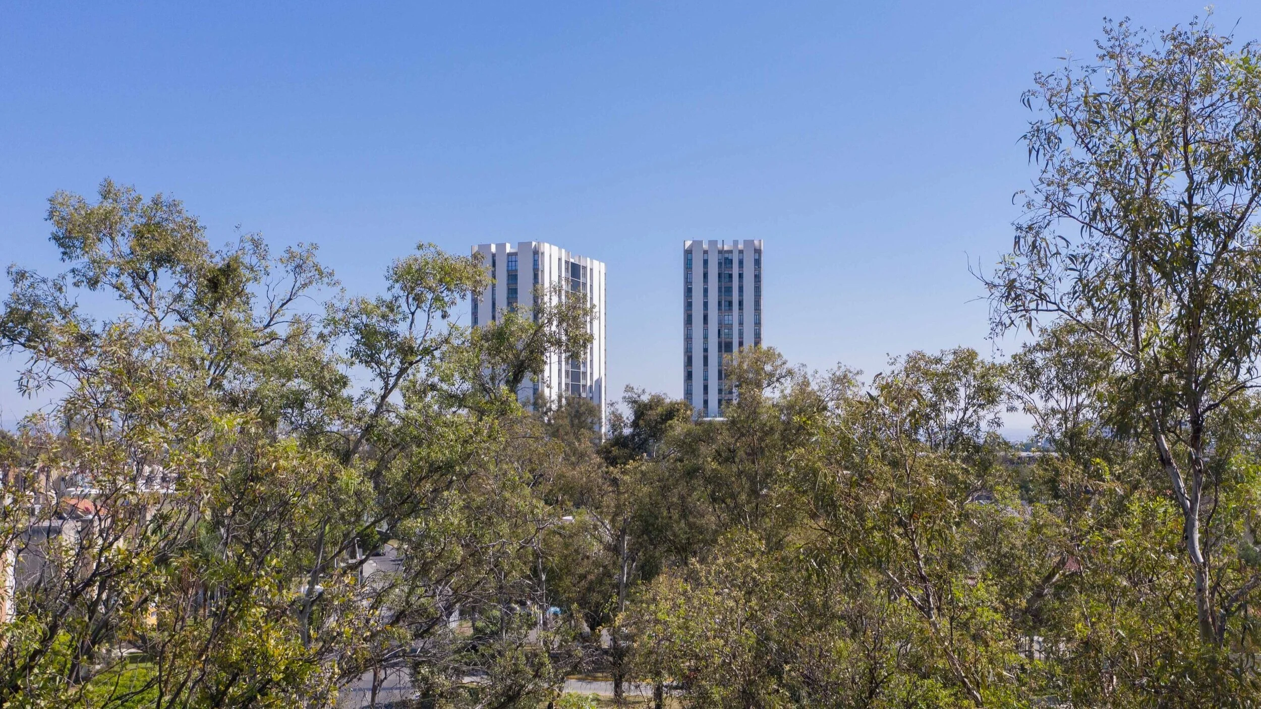 Por un lado, un ángulo de 30 grados entre sus fachadas abre el proyecto a una panorámica visual de automóviles que ingresan a la ciudad. Por otro, los peatones, ciclistas, y usuarios de equipamientos públicos de la zona, gozan del diálogo formal entre las líneas verticales de las torres y el bosque de eucaliptos de la zona que crean estampas reminiscentes a la imagen de The Flatiron de Alfred Stieglitz de 1903.